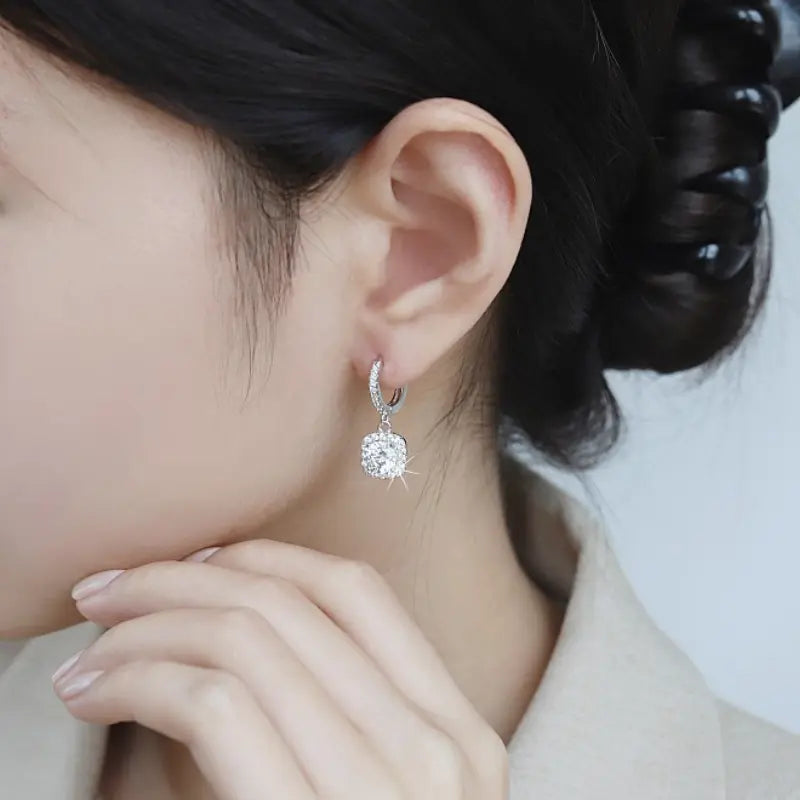 Elegant square earrings crafted from premium Sterling Silver S925 and featuring a brilliant Moissanite center stone surrounded by delicate side accents. The refined geometric design highlights the exceptional sparkle of the Moissanite, creating a luxurious yet subtle look perfect for both daily elegance and special occasions.